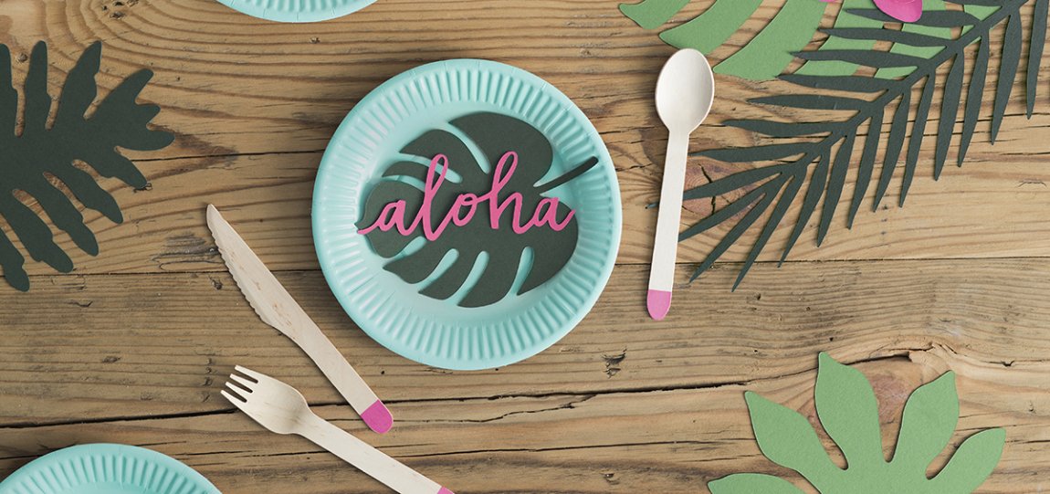 Papirdekorasjoner formet som palmeblader, perfekte til å strø over bord eller bruke som bordkort.