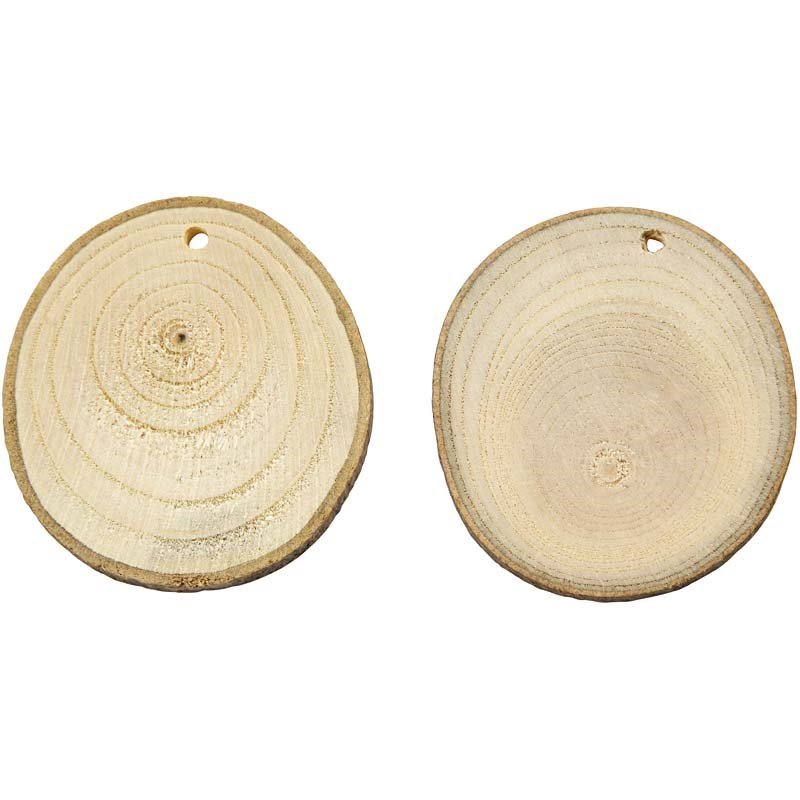 25-pakning med treplater med opphengshull. Skivene er omtrent 5-7 cm i diameter. Superfint å knyte på pakker, rundt en potte, å henge på snorer eller lignende.