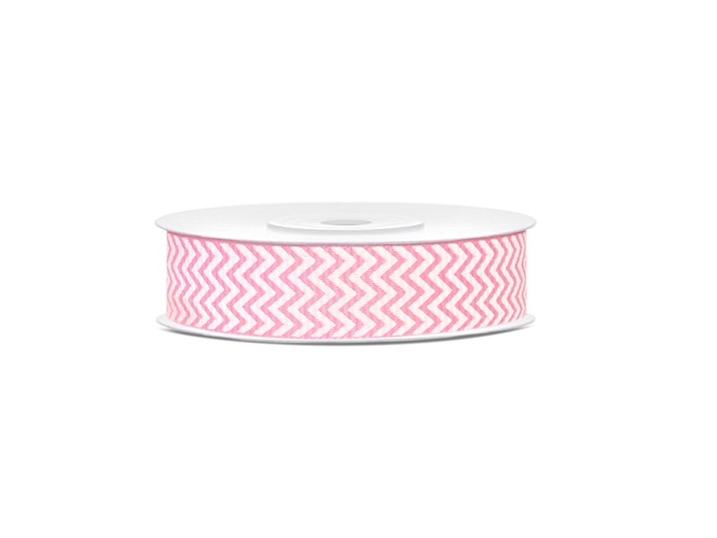 Rull med 10 m grosgrain-bånd. Båndet er 18 mm bredt og har et chevronmønster i lys rosa og hvitt.