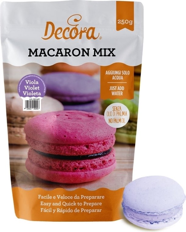 Nå er det enda enklere å lage dine egne makroner! Denne bakemiksen av høy kvalitet inneholder kun naturlige fargestoffer og er fri for palmeolje. Bare tilsett vann! Én pakke er nok til omtrent 35 makroner (dobbel og ca. 3,5 cm i diameter)