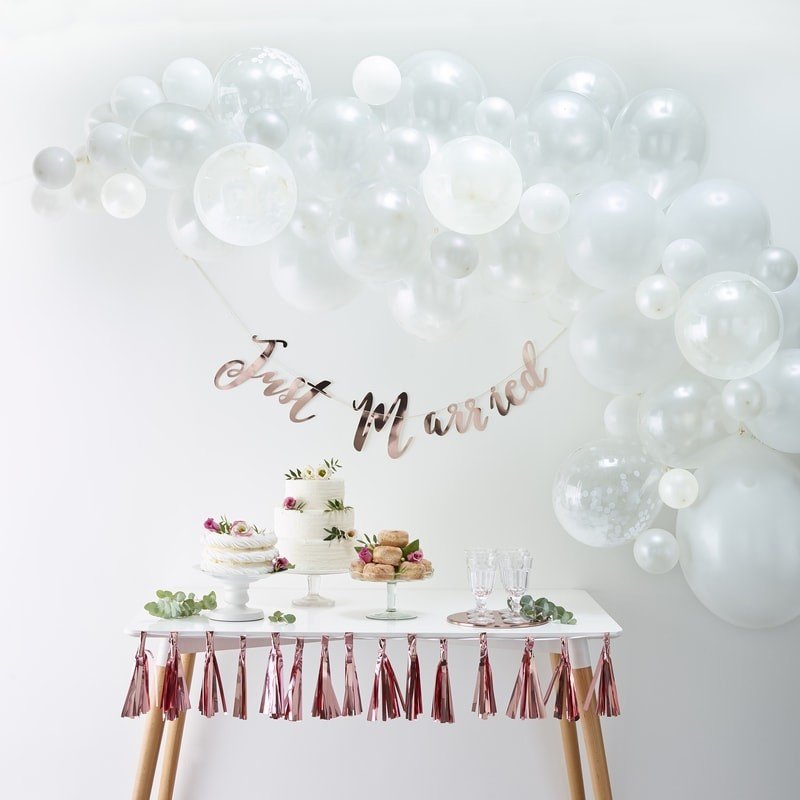 Denne magiske hvite ballongbuen blir garantert festens midtpunkt. Det ville forbløffe enhver gjest. Tips: Gjør det enda mer personlig med blomster eller lignende.