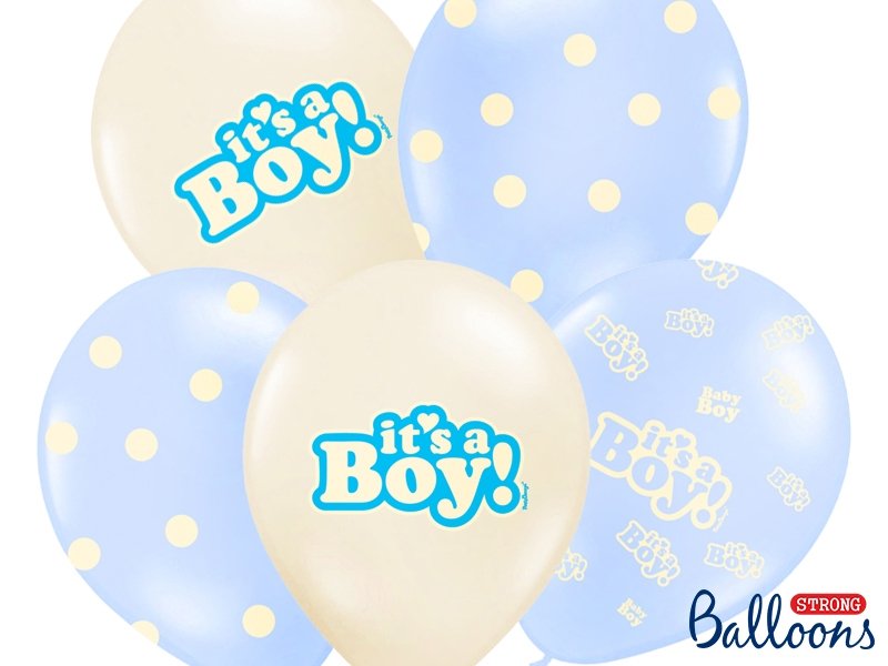 6-pakning med ballonger i tre forskjellige design - babyblå og elfenben. Ballongene er omtrent 30 cm i diameter når de er oppblåst, og kan fylles med både luft og helium.