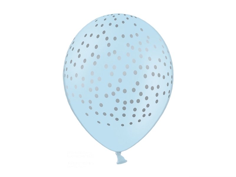 6-pakning med lyseblå lateksballonger med et mønster av uregelmessige, små sølvfargede prikker rundt hele!