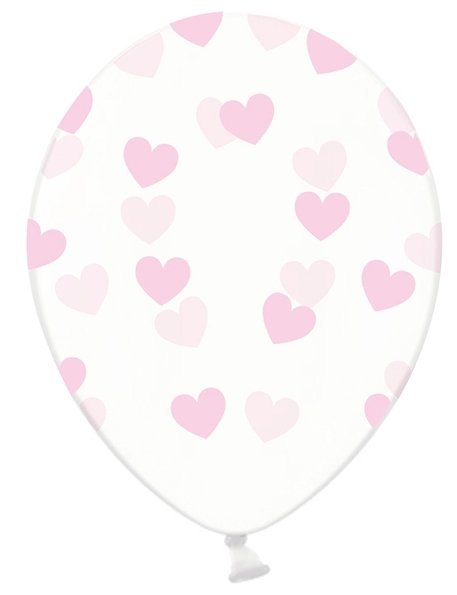6-pakning med gjennomsiktige ballonger med lyserosa hjerter. Ballongene er laget av lateks og er omtrent 30 cm i diameter når de er oppblåst. Kan fylles med både helium og luft.