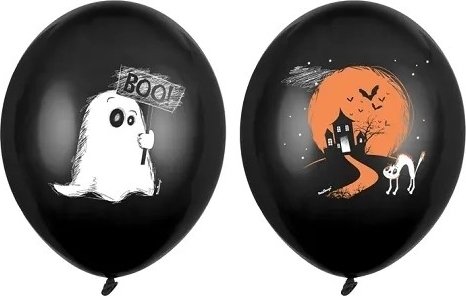 Pakke med 50 svarte Halloween-ballonger, trykt i form av et spøkelse og et hjemsøkt hus. Superfine å blande med vanlige oransje ballonger!