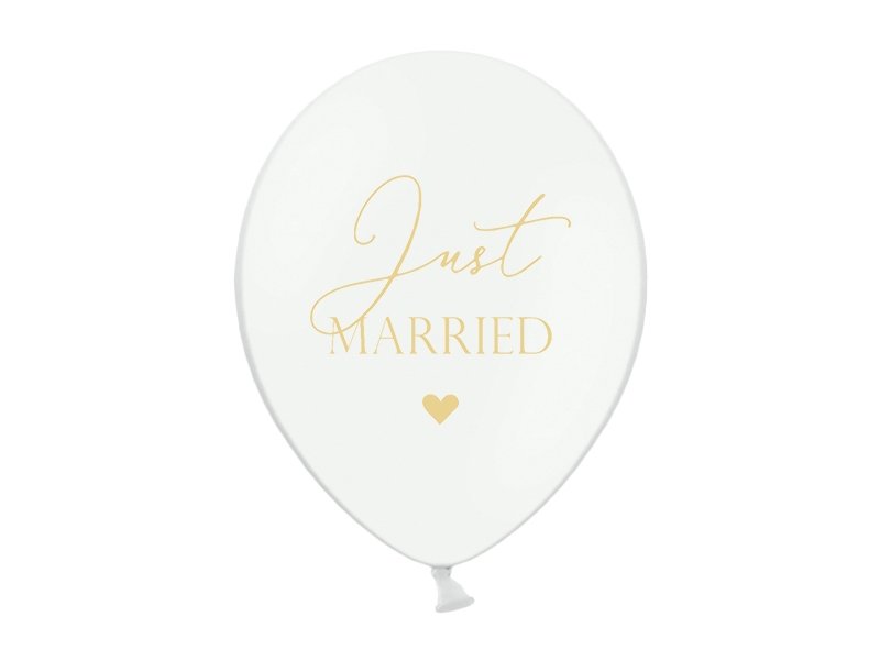 Pakke med 50 hvite ballonger med gulltrykk - Just Married. Ballongene er omtrent 30 cm i diameter når de er oppblåst, og kan fylles med både helium og luft.