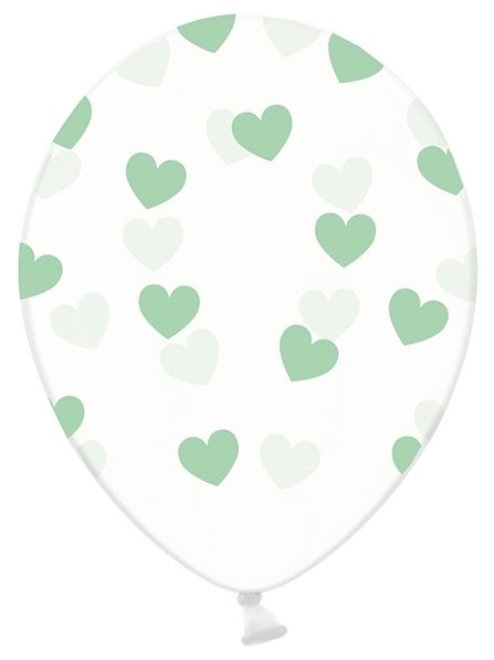 6-pakning med gjennomsiktige ballonger med mintgrønne hjerter. Ballongene er laget av lateks og er omtrent 30 cm i diameter når de er oppblåst. Kan fylles med både helium og luft.