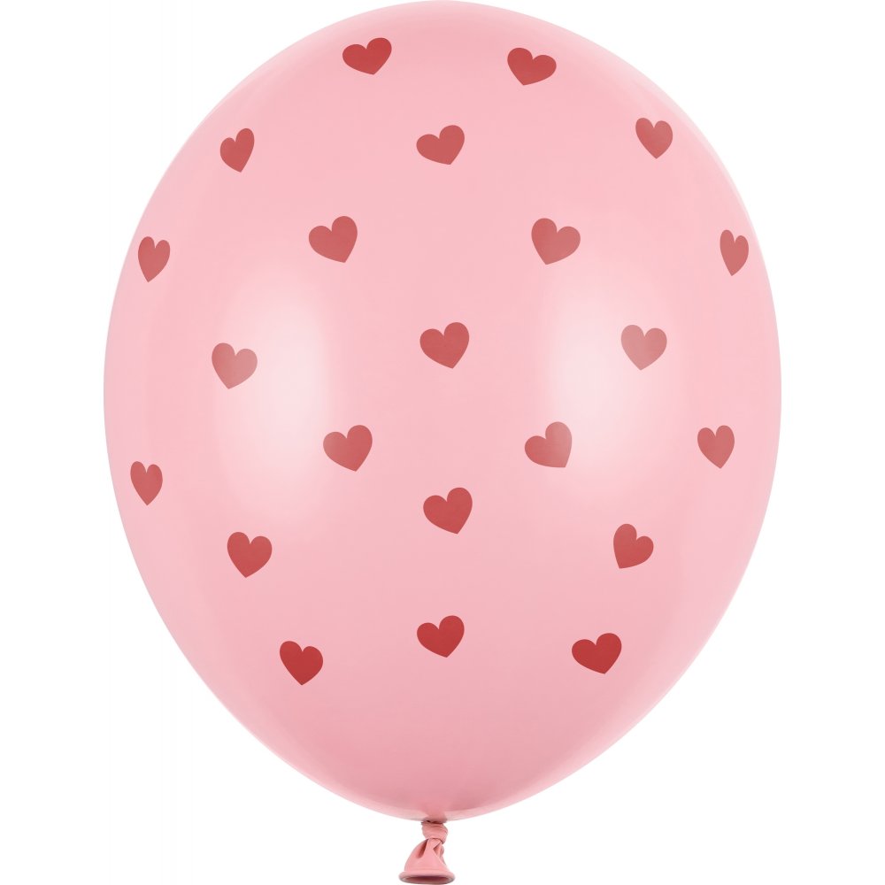 6-pakning med ballonger i lys rosa med røde hjerter.
