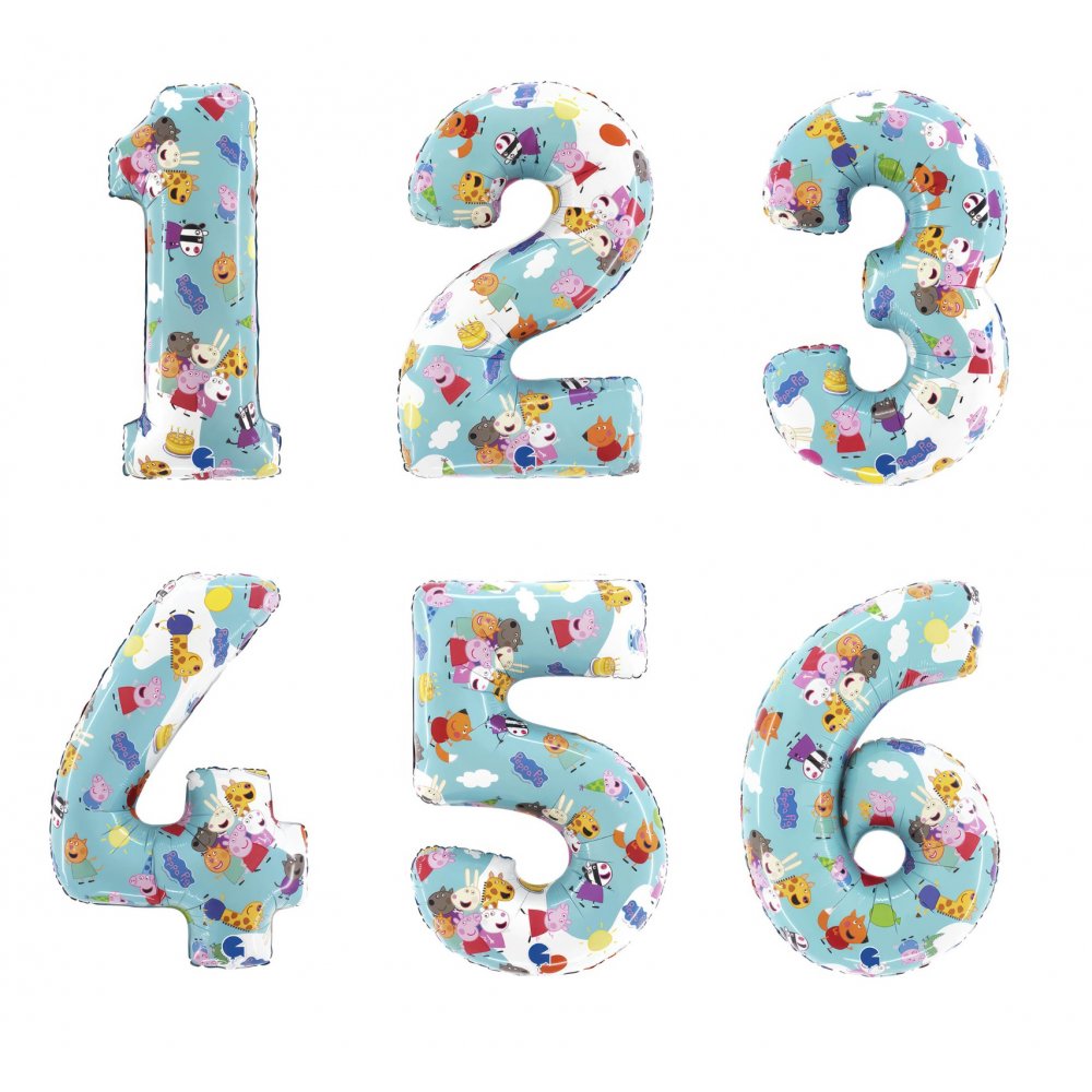 Superfine Greta Gris tallballonger av høy kvalitet som kan fylles med både luft og helium. Ballongene er omtrent 66 cm høye når de er oppblåst. Selges enkeltvis og tilgjengelig i nummer 1-6.