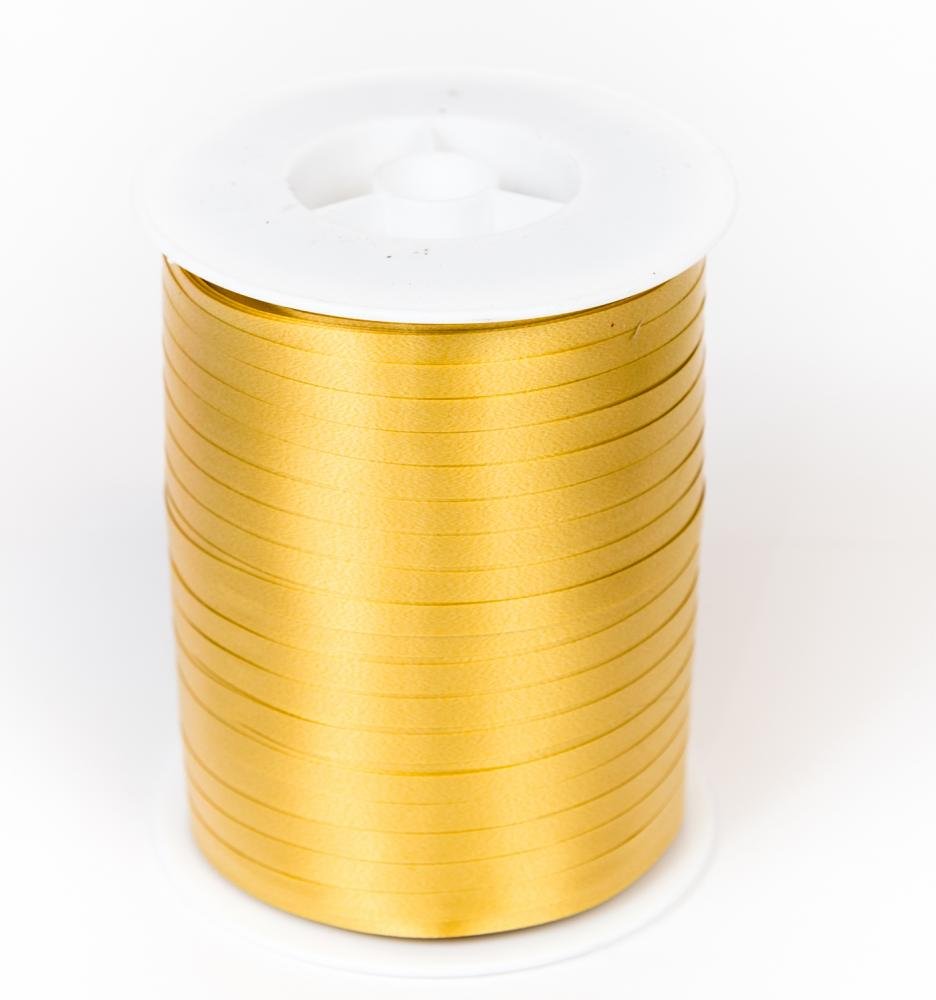 Matt, gullfarget ballongsnor på rull. Størrelse: 5 mm bred og 500 m per rull.