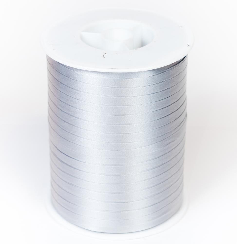 Sølvfarget ballongsnor på rull. Størrelse: 5 mm bred og 500 m per rull.