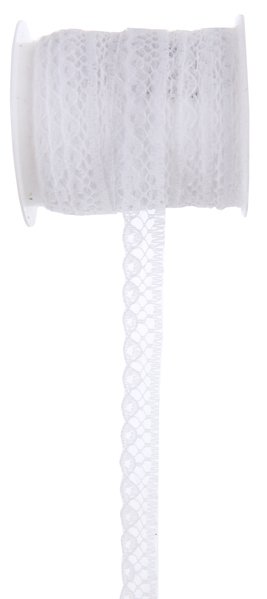Hvitt blondebånd på rull. Tapen er 10 mm bred, og en rull består av 5 meter.