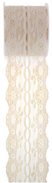 Kremhvitt blondebånd på rull. Tapen er 50 mm bred, og en rull består av 3 meter.