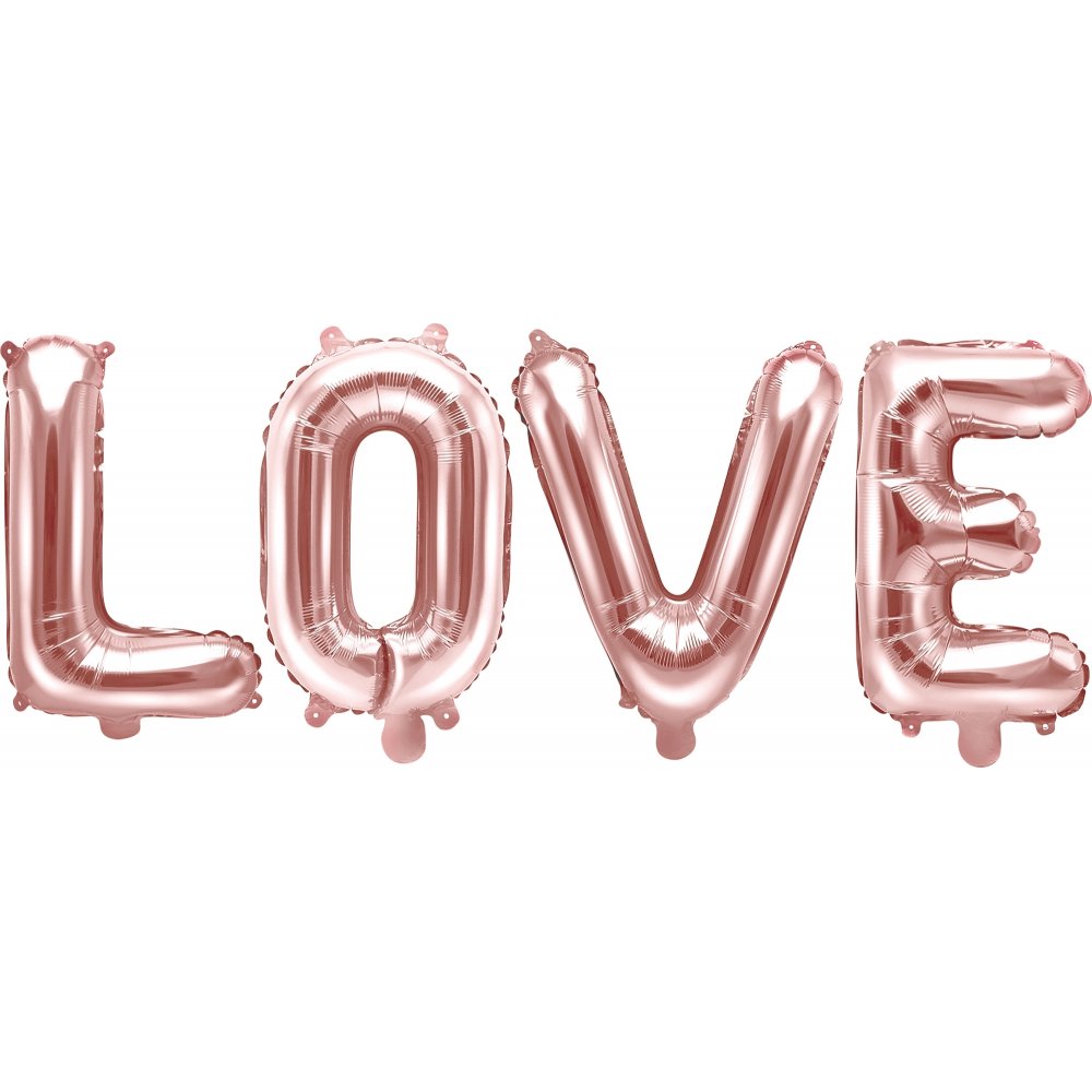 Supersøte bokstavballonger i roségull som danner ordet LOVE.