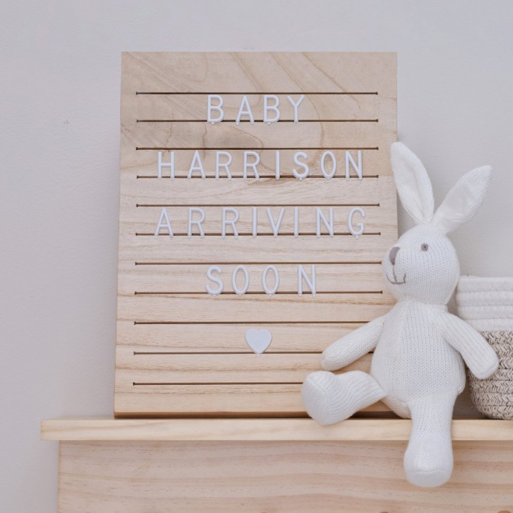Tavlen er 30 x 20 cm og leveres med 170 bokstaver, tall og symboler for å personliggjøre den.