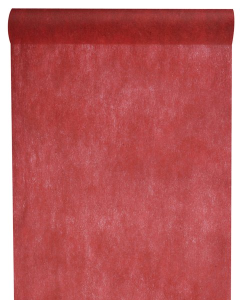 Burgunderfarget bordløper på rull i ikke-smykket materiale. Løperen er 30 cm bred og 10 meter lang.