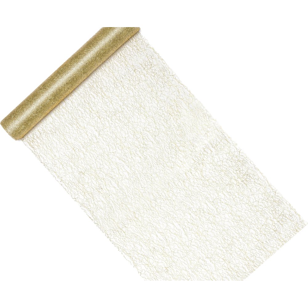 Gullfarget bordløper i netting som skaper en fin effekt på bordet over en ensfarget duk!