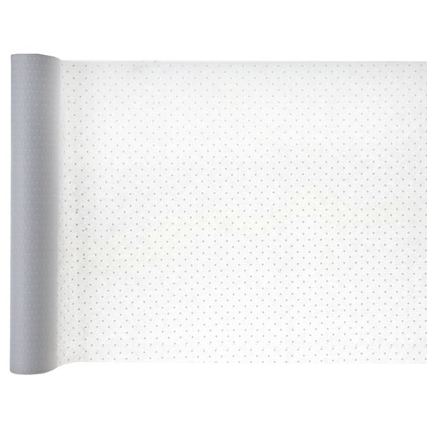 Hvit duk med små hvite prikker. Løperen er 5 meter lang og 30 cm bred.