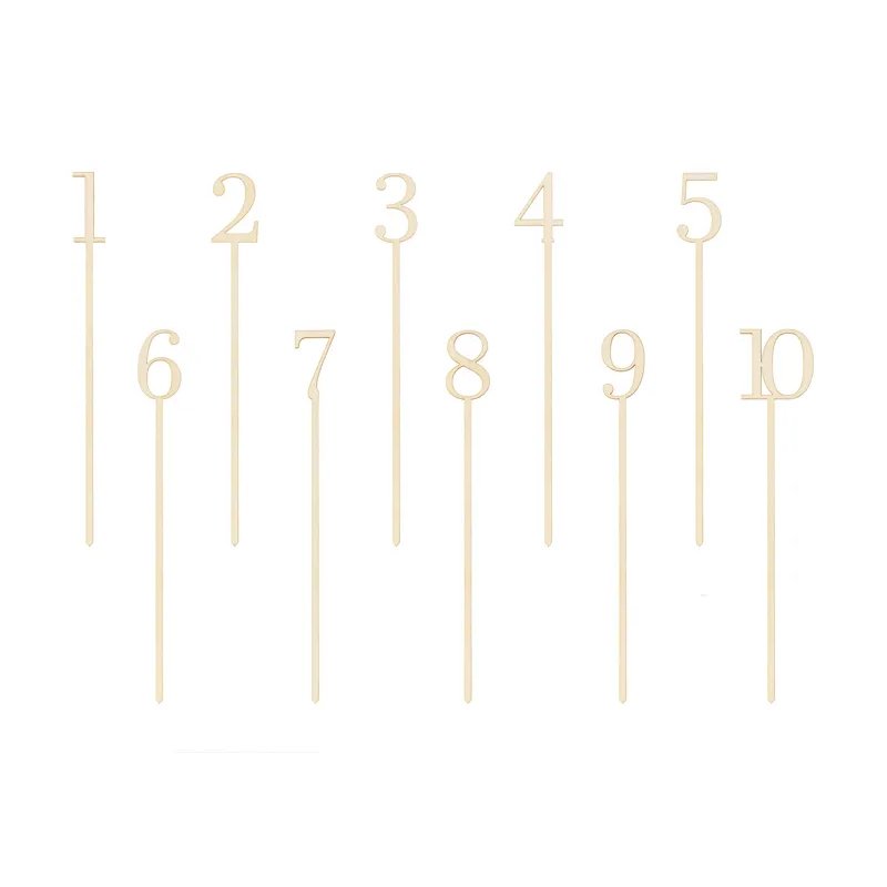 Bordnummerering i tre med tallene 1-10, perfekt for å markere bordnumrene i bryllupsfesten.