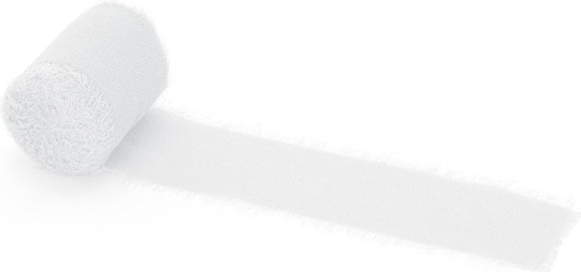 Veldig fint hvitt chiffonbånd på rull. Tapen er 40 mm bred, og en rull består av 5 meter. Hver pakke inneholder 3 ruller, totalt 15 m.