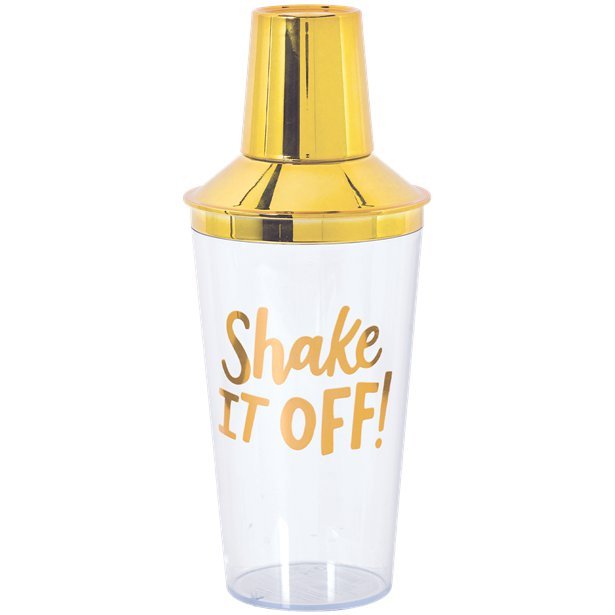 Plastcocktailshaker med gulllokk og teksten «Shake it off».