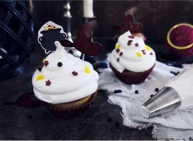 Muffinsformer i rødt og svart, med tilhørende kakepinner formet som en heksehatt og en heksegryte! Pakken består av 24 muffinsformer og 24 kakeformer.