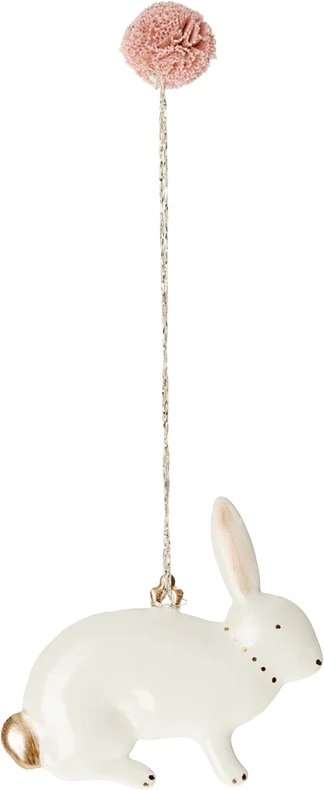Dekorasjon i form av en påskehare. Kan henges opp eller plasseres på påskebordet.