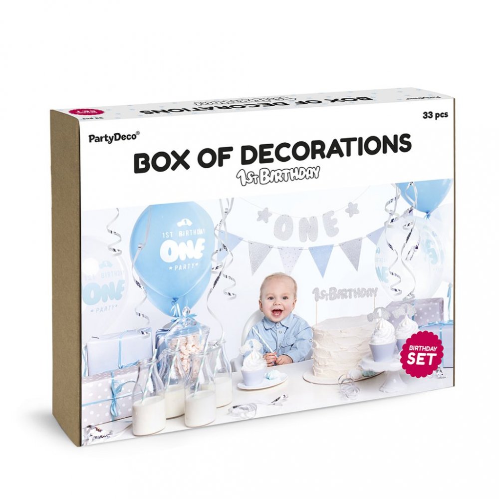Settet består av: banner One, girlander, 6 x kakepinner, 6 x cupcake-papir, kakedekorasjon, 10 x sugerør, 6 x ballonger, serpentiner, lyseblått satengbånd.