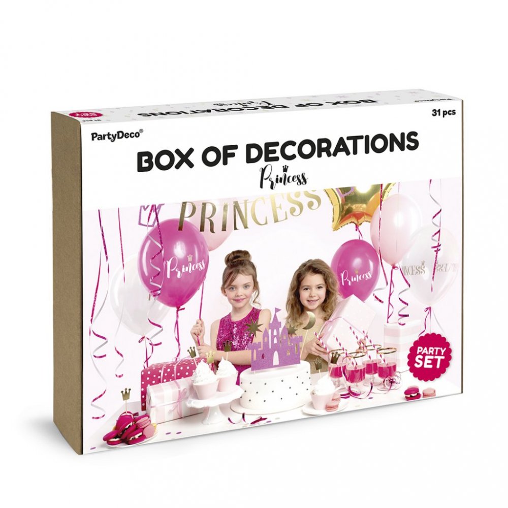 Dekorasjonssett med prinsessetema. Perfekt sett for å få alle detaljene på plass til festen.