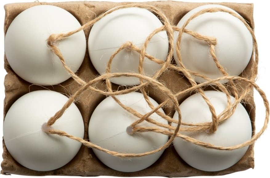 6-pakning med hvite egg med hyssing. Perfekt til maling/dekorering og oppheng i påsken! Eggene er laget av PS-plast.