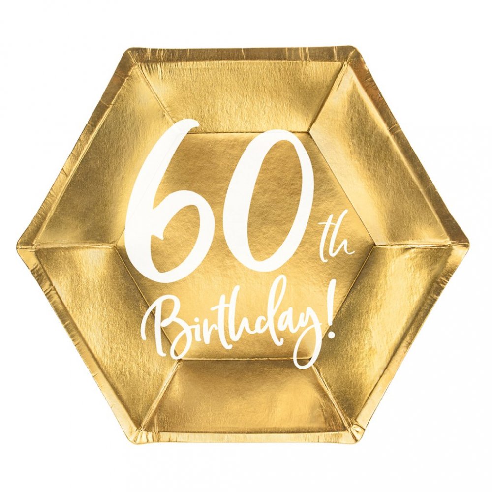 6-pakning med gullfargede desserttallerkener med trykk - 60-årsdag. Perfekt for 60-åringen.