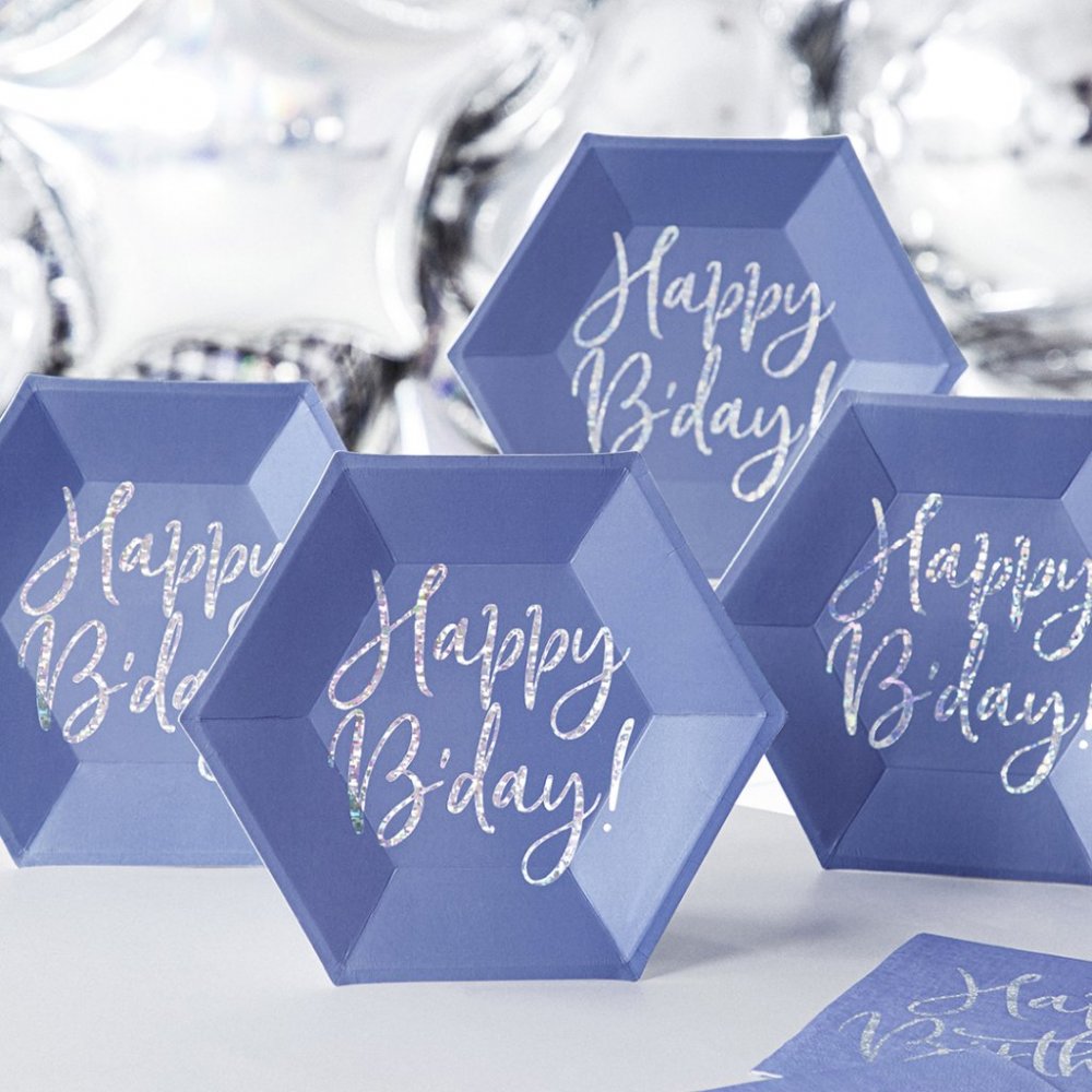 Desserttallerkener - Gratulerer med dagen - Blå/Iriserende - 6-pakning