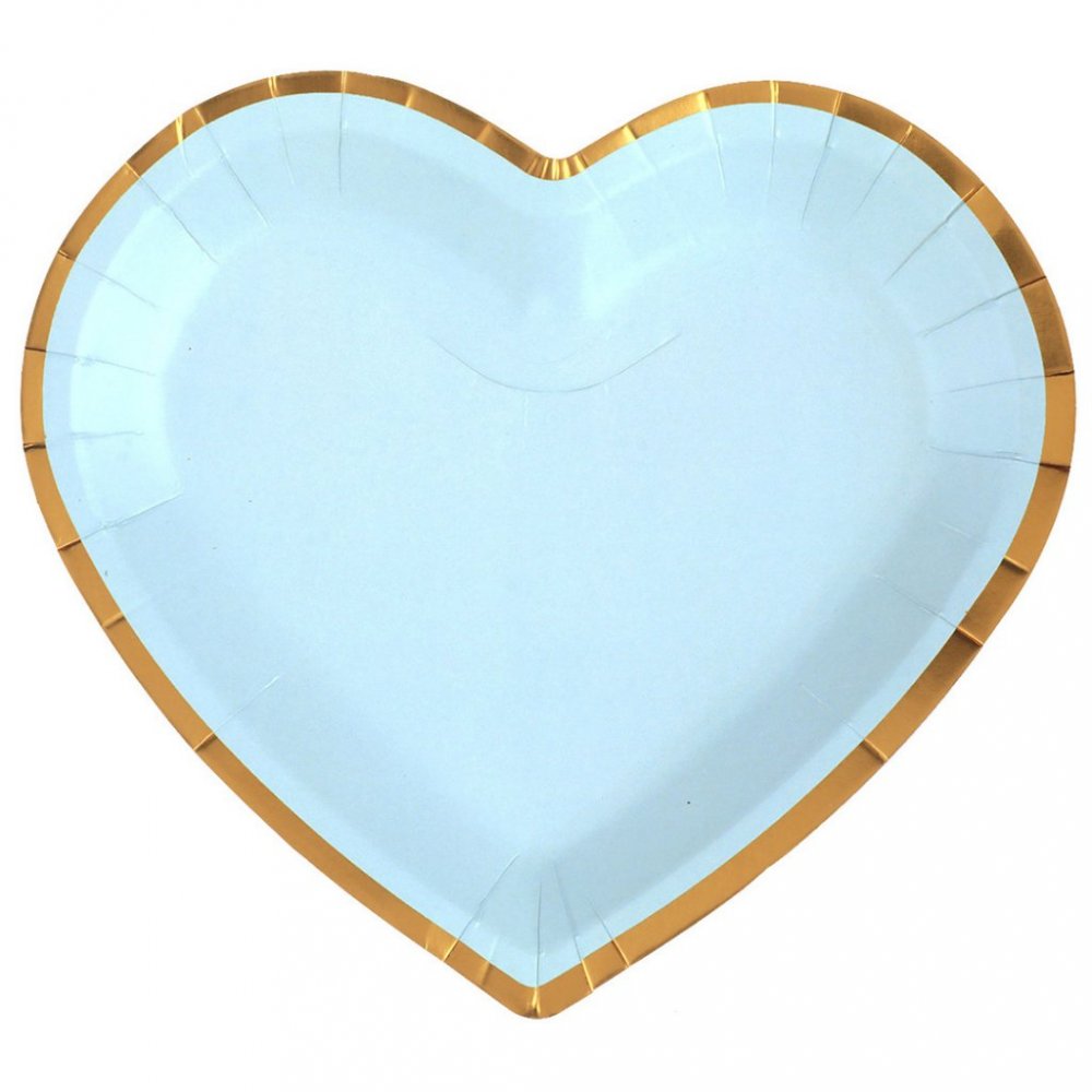 10-pakning med hjerteformede papptallerkener i blått med roségullkant.