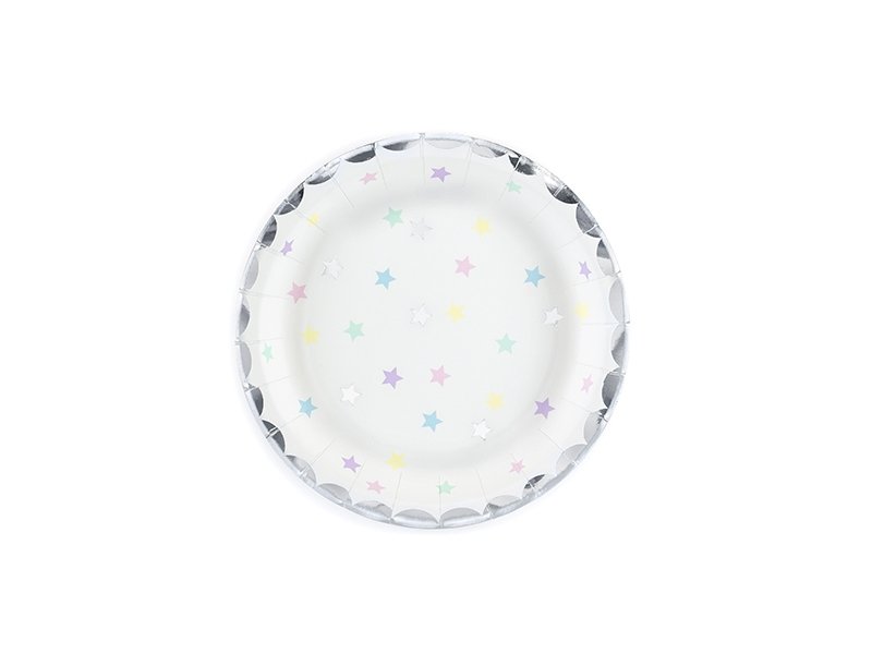Pakke med 6 små papptallerkener med et flott mønster i form av pastellstjerner og detaljer i sølvmetallic.