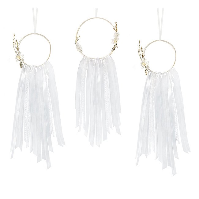 3-pakning med drømmefangere med vakre satengbånd og blomster i hvitt.