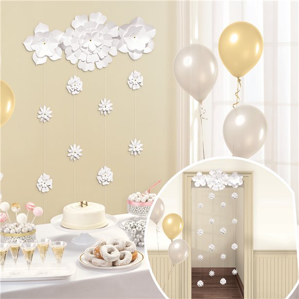 Hvitt gardin med blomster, så fint å henge i døråpningen.