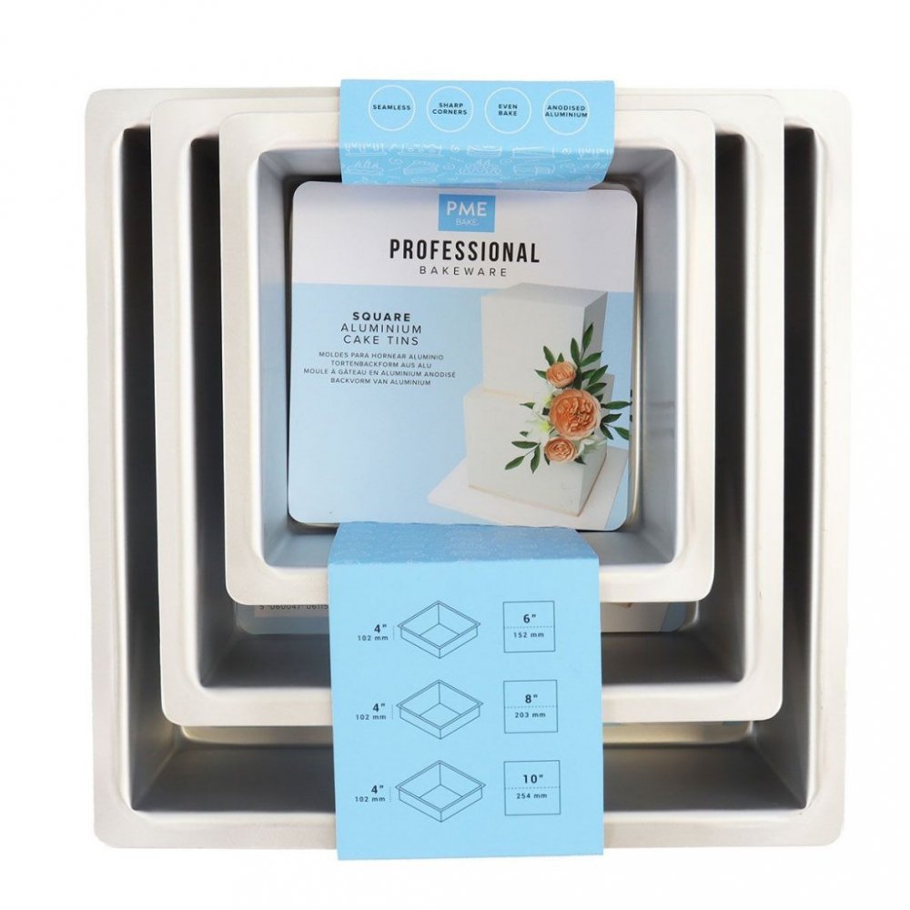 Kakeformer med ekstra høye kanter for å lage høye kakebunner og kaker. Laget av kraftig anodisert aluminium, støpt i ett stykke. Perfekte 90-graders vinkler for en ypperlig autentisk firkantet kake.