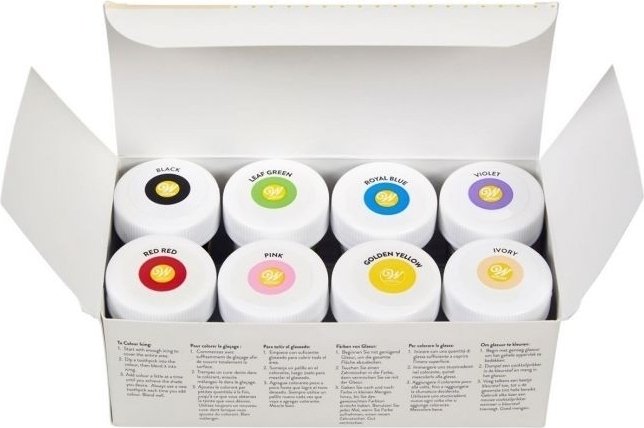 Med disse spiselige fargene kan du enkelt fargelegge alt fra sukkerpasta/fondant til smørkrem, fortryllet krem, marsipan, glasur eller kakedeig! Settet inneholder 8 svært konsentrerte farger: Gyllengul, Fiolettblå, Rødrød, Rosa, Bladgrønn, Elfenben og Svart. Gjør dette: Bruk en tannpirker eller annen pinne til å ta litt farge ut av pakken. Bruk en ren nål hver gang. Siden fargen er veldig tykk, start med litt og tilsett mer om nødvendig, til du oppnår ønsket farge. Elt eller rør godt mellom hver tilsetning (for en marmorert effekt på f.eks. sukkerpasta, elt bare litt!). Fungerer for alle vannløselige produkter, ikke egnet for sjokolade. Ingredienser: glukosesirup, glyserol, sukker, fargestoff (E102*, E129*, E122*, E133, E110*, E153), surhetsregulerende middel (E330), antioksidant (E331), fortykningsmiddel (E406), konserveringsmiddel (E202). *kan ha en negativ effekt på aktivitet og oppmerksomhet hos barn.