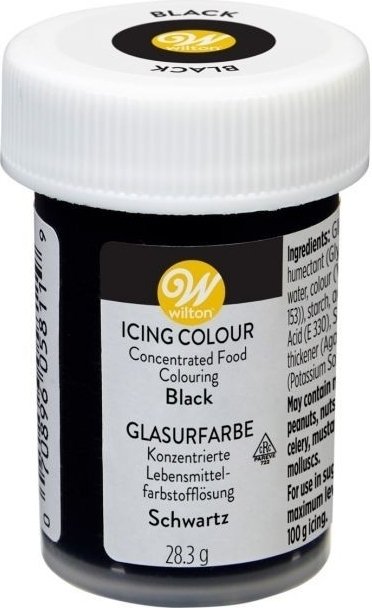 Med Wiltons spiselige farger kan du enkelt farge alt fra sukkerpasta/fondant til smørkrem, enchanted cream, marsipan, glasur eller kakerøre! Inneholder svært konsentrert svart farge. Slik gjør du: Bruk en tannpirker eller annen pinne for å ta ut litt farge fra pakken. Bruk en ren nål hver gang. Siden fargen er veldig tykk, start med litt og tilsett mer om nødvendig, til du oppnår ønsket farge. Elt eller rør godt mellom hver tilsetning (for en marmorert effekt på f.eks. sukkerpasta, elt bare litt!). Fungerer for alle vannløselige produkter, ikke egnet for sjokolade. Ingredienser: glukosesirup, sukker, glyserol, vann, fargestoff (E153), surhetsregulerende middel (E330), antioksidant (E331), fortykningsmiddel (E406), konserveringsmiddel (E202). Kan inneholde spor av melk, soya, hvete, peanøtter, nøtter, fisk, selleri, krepsdyr, sennep og bløtdyr.