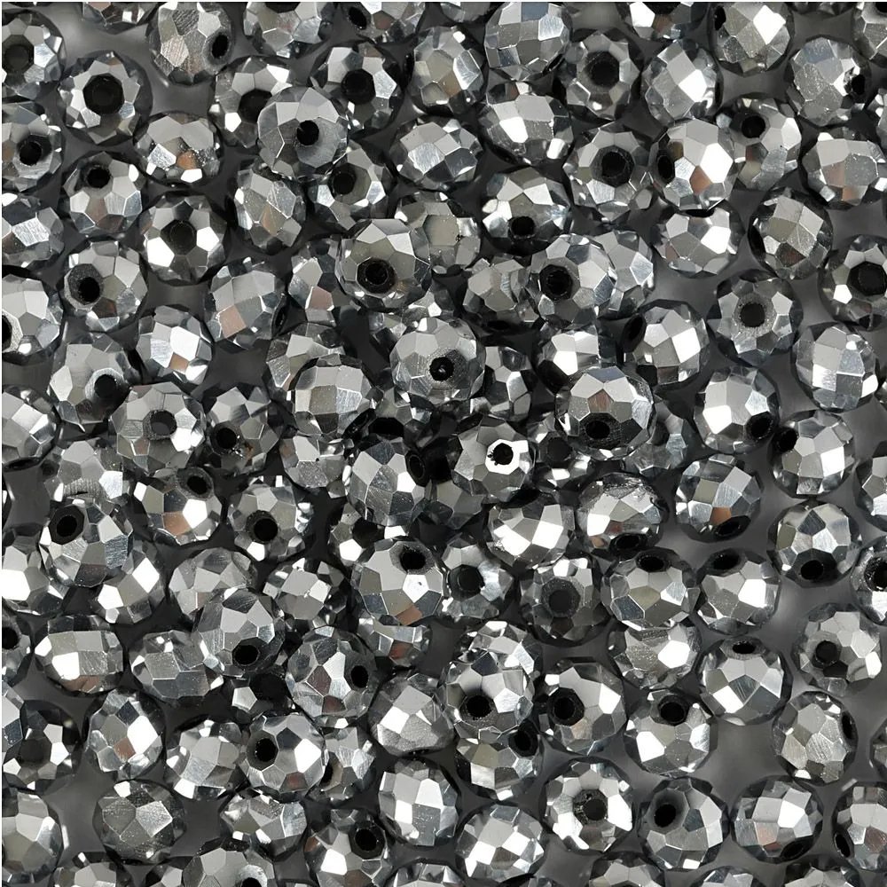 Glassperler med kantete design i skinnende sølv.