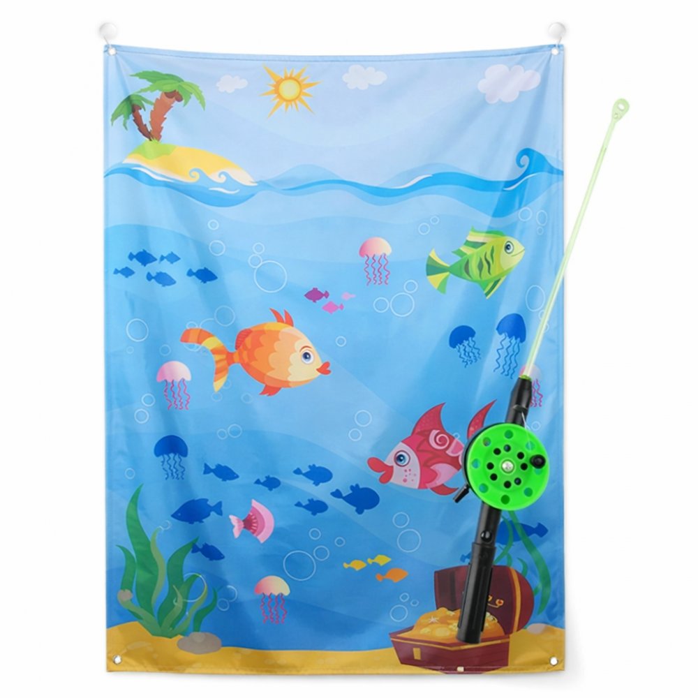 Komplett sett med fiskedamduk og lekefiskestang til barnefester og andre festlige anledninger. Den turkise fiskedamskjermen er dekorert med sjøfisk og en skatt i bunnen, noe som skaper en morsom og engasjerende aktivitet for barn i alle aldre.