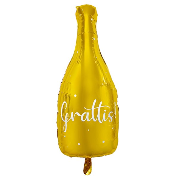 Superfin folieballong i form av en gullfarget champagneflaske og teksten Gratulerer.