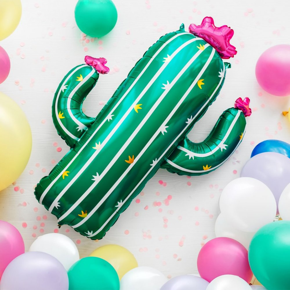 Stor og superfin folieballong i form av en kaktus med rosa blomster.