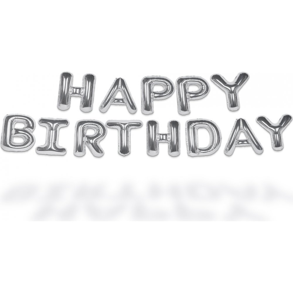 Folieballonger i girlander med teksten «Gratulerer med dagen» i sølv. Hver bokstav er 35 cm høy.