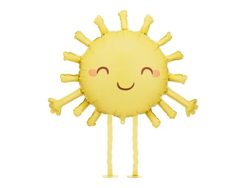 Gul folieballong formet som en sol med ben.