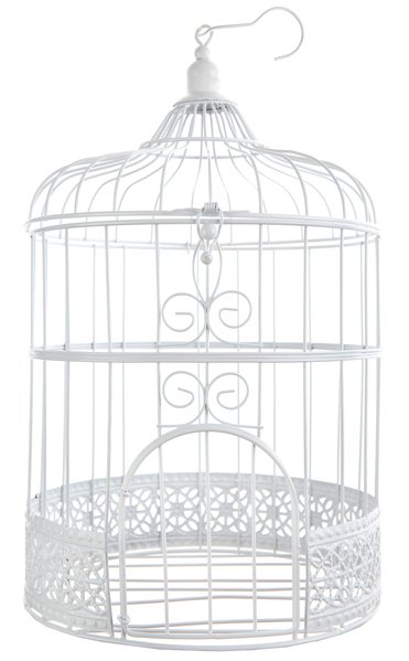Hvitt fuglebur - superfint som bordpynt eller som en «kortboks» for gjester å legge gavekort eller gode ønsker i.