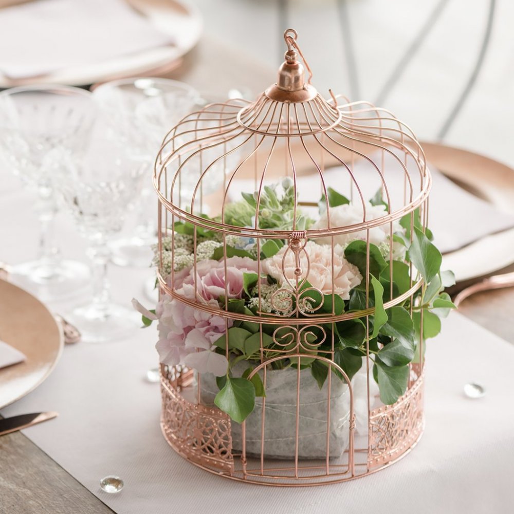 Fuglebur i roségull - superfint som borddekorasjon eller som kortboks for gjester å legge gavekort eller gode ønsker i.