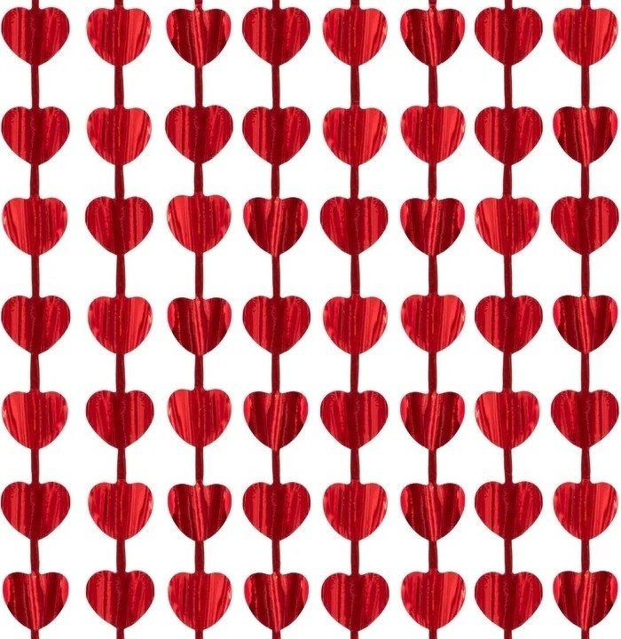 Bakteppe i form av et stort draperi formet som skinnende røde hjerter. Den vil se flott ut som bakgrunn for en fotoboks eller som dekorasjon bak en buffet- eller dessertbord, og er helt perfekt for en Valentinsdagsfest!