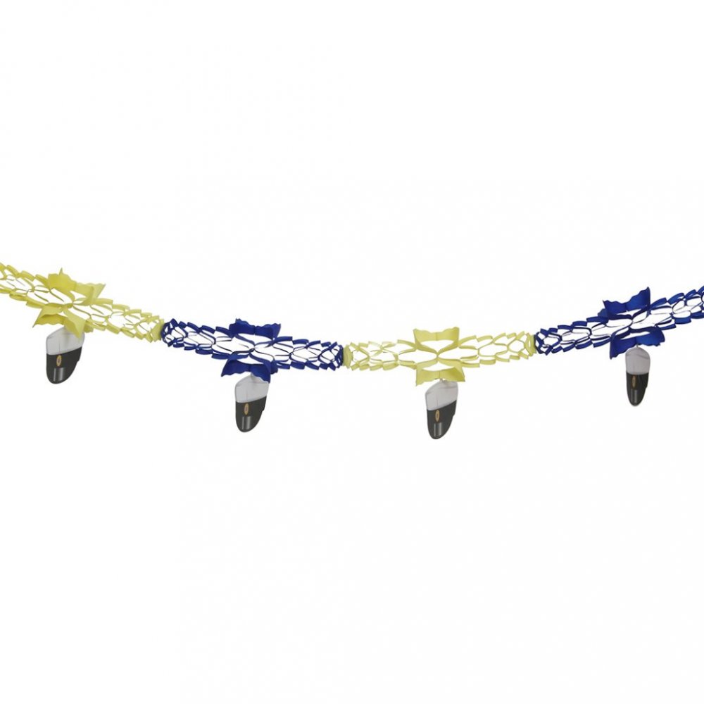 Superfin girlander i gult og blått med hengende konfirmasjonsluer.