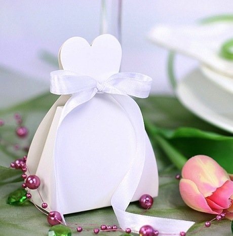 Esken er omtrent 9x7 cm brettet sammen. Satengbånd følger med i hver eske. Eskene leveres flate/umonterte.